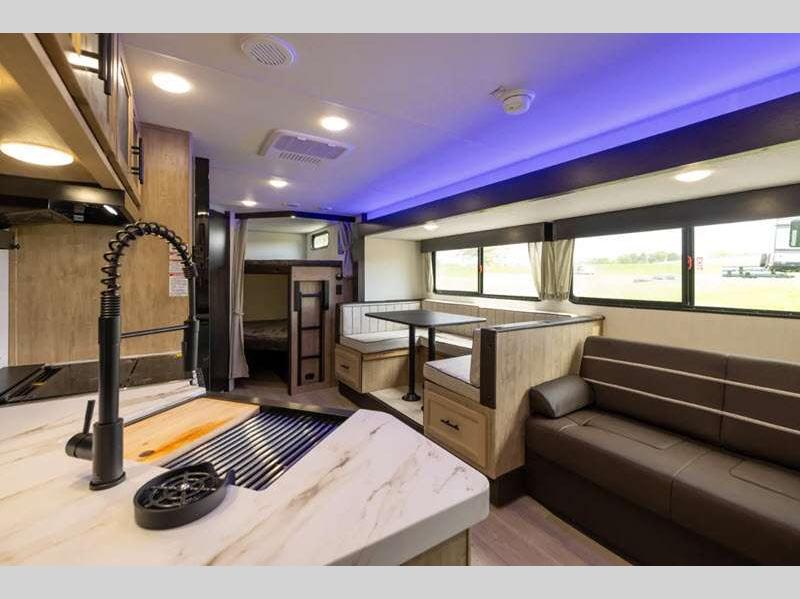 Sleeps 9 Slides 1 Length 32 ft 9 in Ext Width 8 ft Ext Height 10 ft 5 in Int Height 0 ft Hitch Weight 755 lbs GVWR 7755 lbs Dry Weight 6403 lbs Cargo Capacity 1352 lbs Fresh Water Capacity 52 gals Grey Water Capacity 38 gals Black Water Capacity 38 gals Furnace BTU 20000 btu Number Of Bunks 2 Available Beds RV King Refrigerator Type 12V Cooktop Burners 3 Number of Awnings 1 Water Heater Type Tankless AC BTU 15000 btu Cargo Deck Size 0 ft Awning Info 15' Full Length Power w/LED Light Strip Axle Count 2 Shower Type Tub/Shower Combo Solar Wattage 200 watts Similar Floorplans